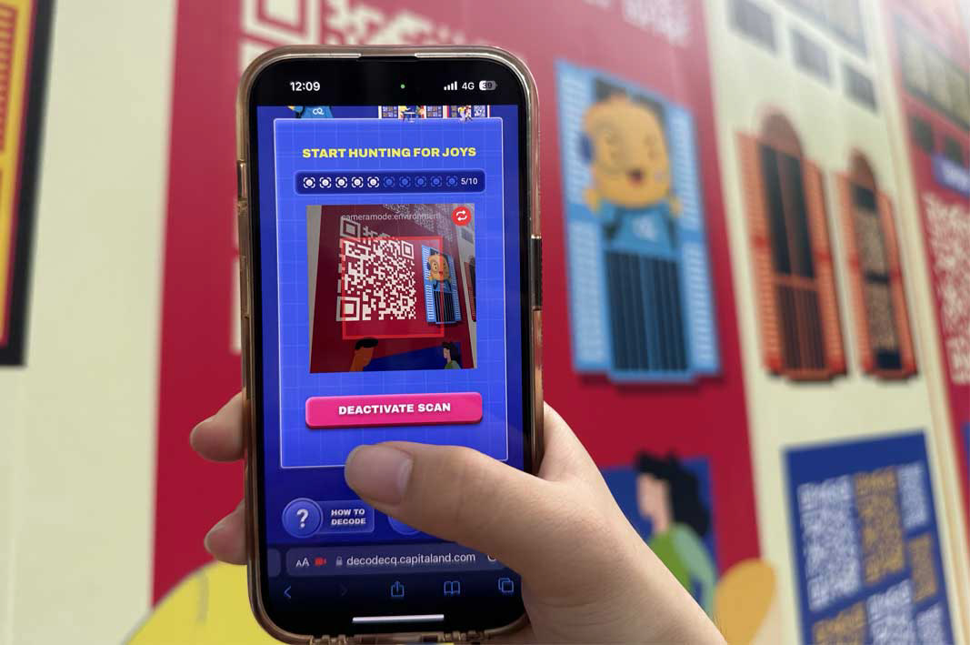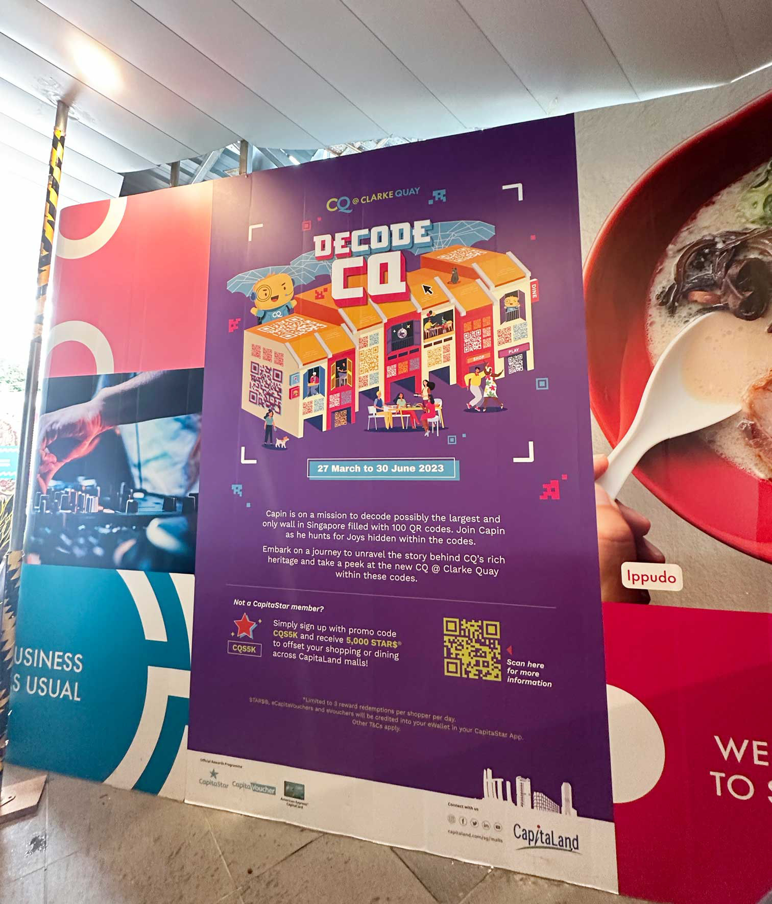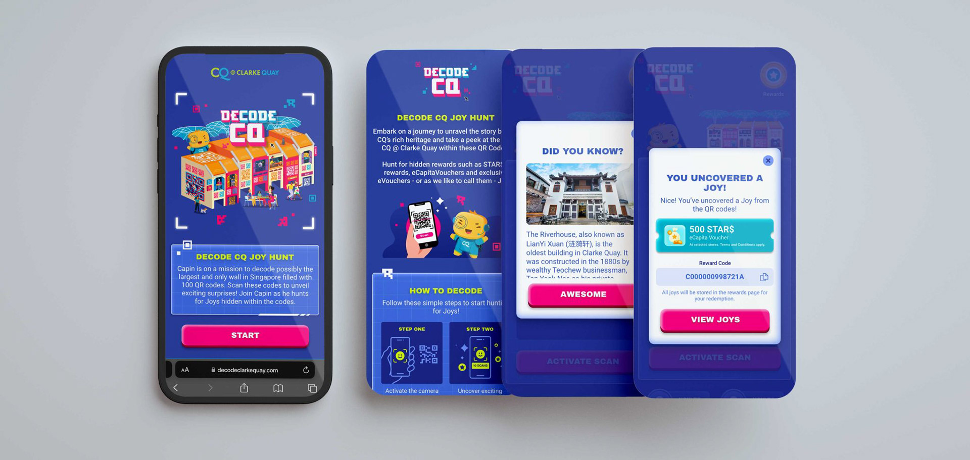The objective of this project was to maintain awareness and foot traffic for unaffected tenants during the renovation of Clarke Quay (CQ). The CQ Decode campaign sought to achieve this by creating an interactive hoarding wall, leveraging on QR codes. Capin, the campaign mascot, guided participants through a thrilling mission to decode a wall adorned with 100+ QR codes, each revealing a piece of information about CQ. Across three months, visitors were invited to scan QR codes on the Joy Wall to access a dedicated campaign site, providing insights into CQ's rich heritage and what CQ has to offer. Participants had the chance to win daily prizes like eCapitaVouchers to encourage spending at this Capitaland mall.