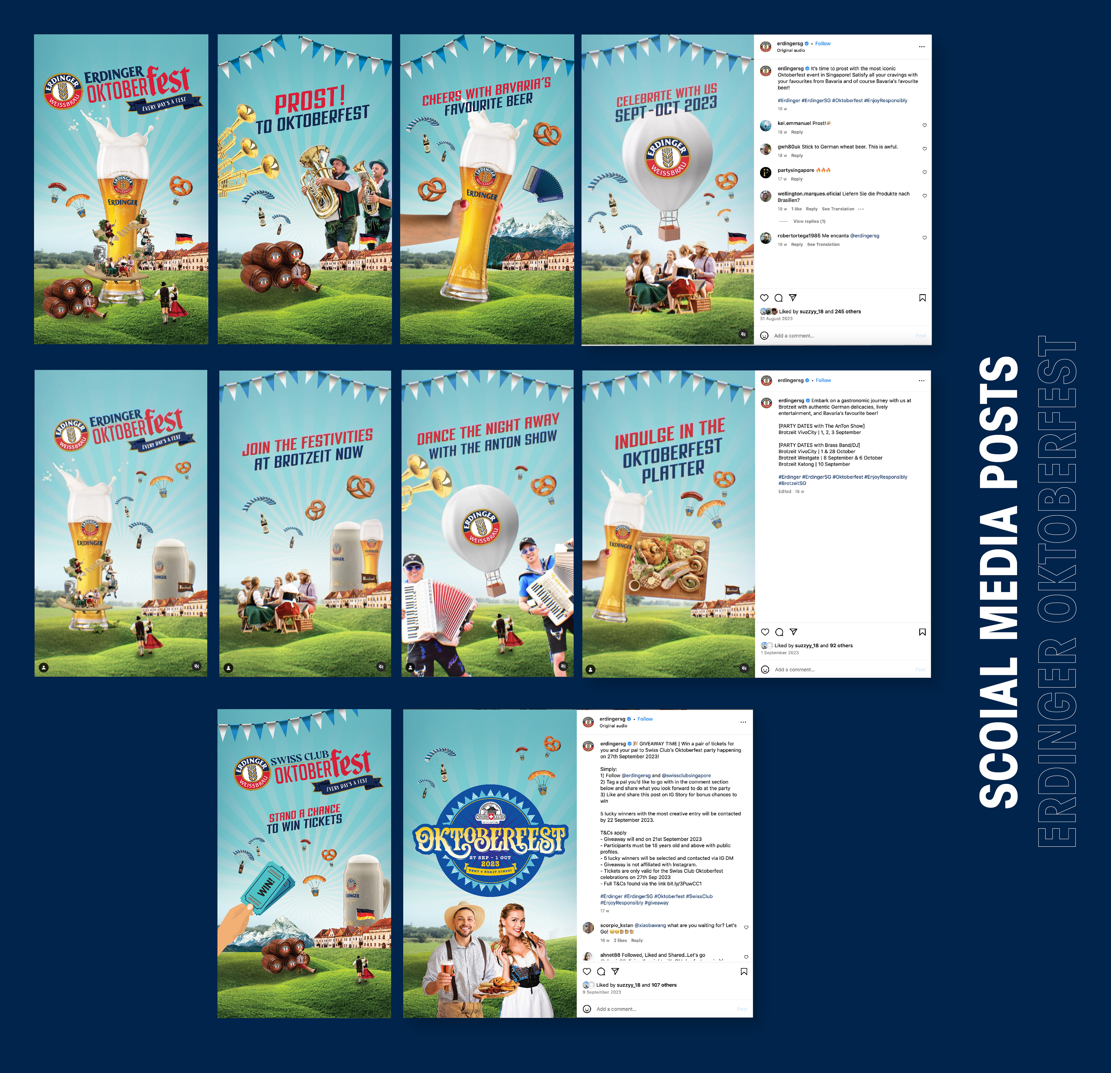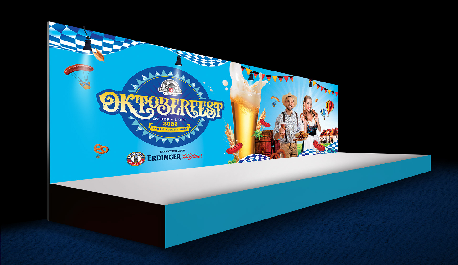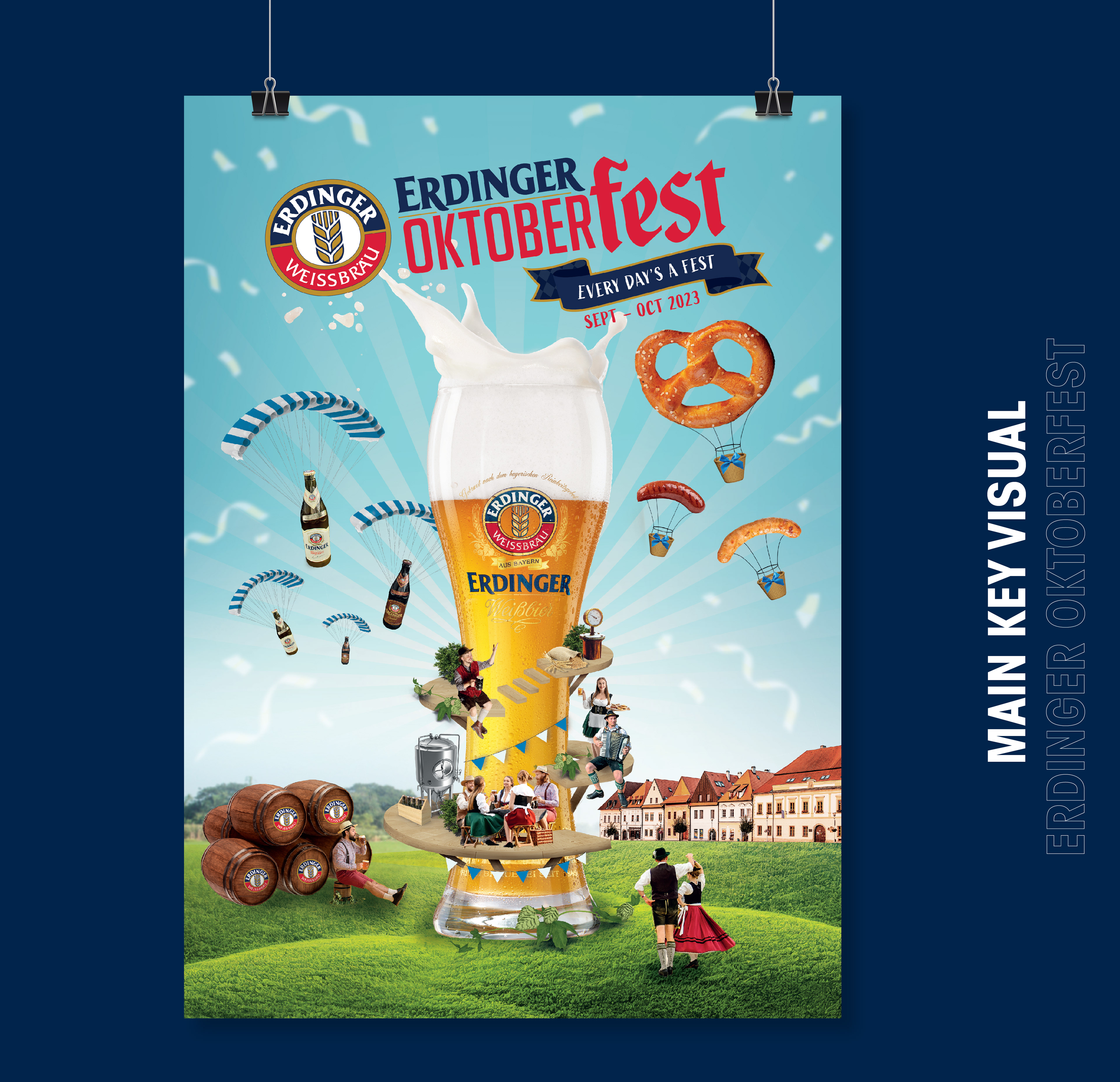 As the covid restrictions loosens, the annual Oktoberfest is back with its official German beer brand - Erdinger. We were tasked to design the main visual for Erdinger's 2023 Oktoberfest and adapting it to its respective touch points, banners, shirt and social media. Erdinger also partnered with The Swiss Club for the annual Oktoberfest. A separate, more traditional Oktoberfest visual was produced for the event as well.