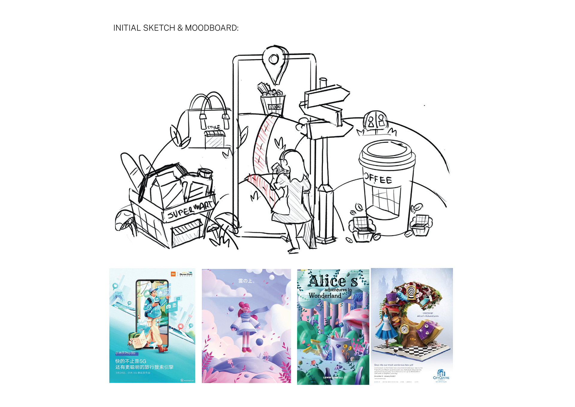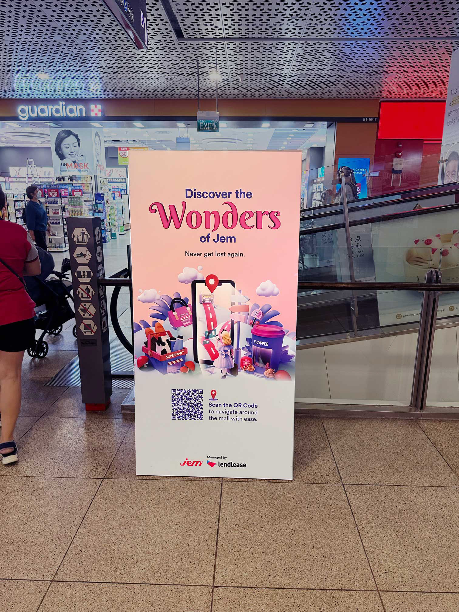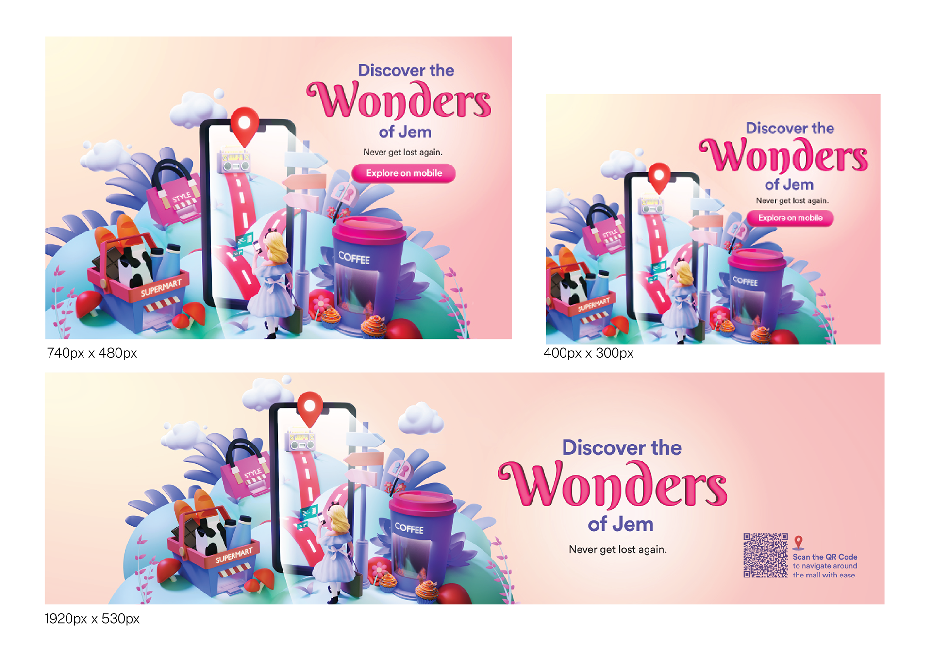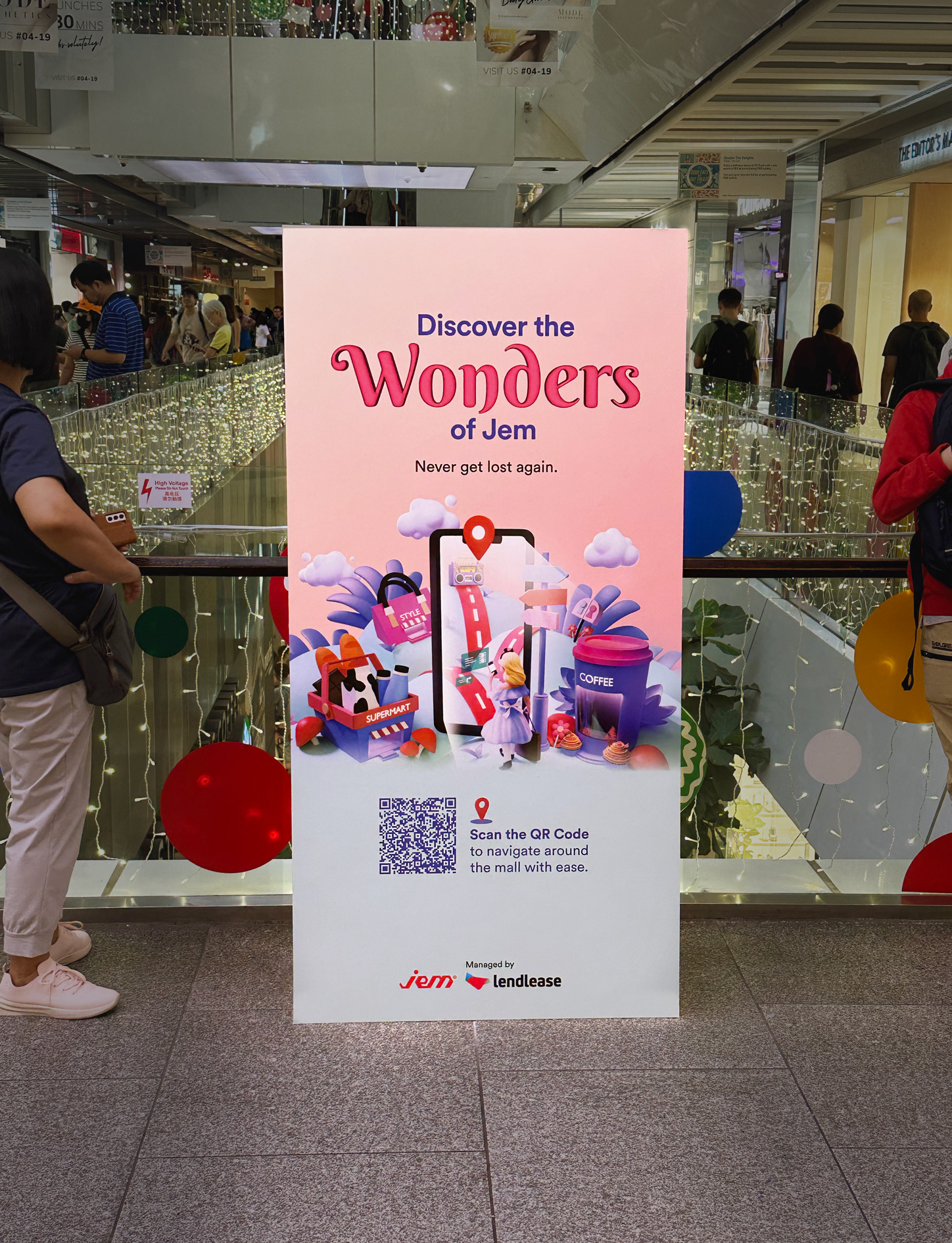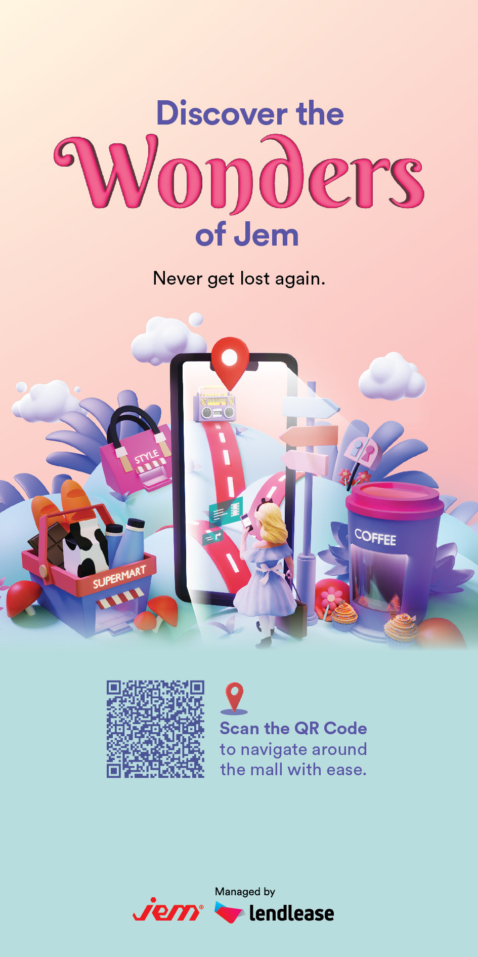 "Through the Looking Glass: Discover the Wonders of JEM" is a mall directory signage to encourage shoppers to check out the new digital directories across the mall and now available on their mobile. The concept is inspired by 'Alice in Wonderland' where the protagonist peers through the looking glass as she explores wonderland. We use this concept to reflect how shoppers and now navigate through JEM’s directory and explore the wonders it brings. We use sophisticated 3D elements are incorporated into the KV. These elements highlight the shopping’s elements such as café, groceries, and lifestyle shopping. The visual concept aims to entice shoppers to delve into the wonders of JEM.