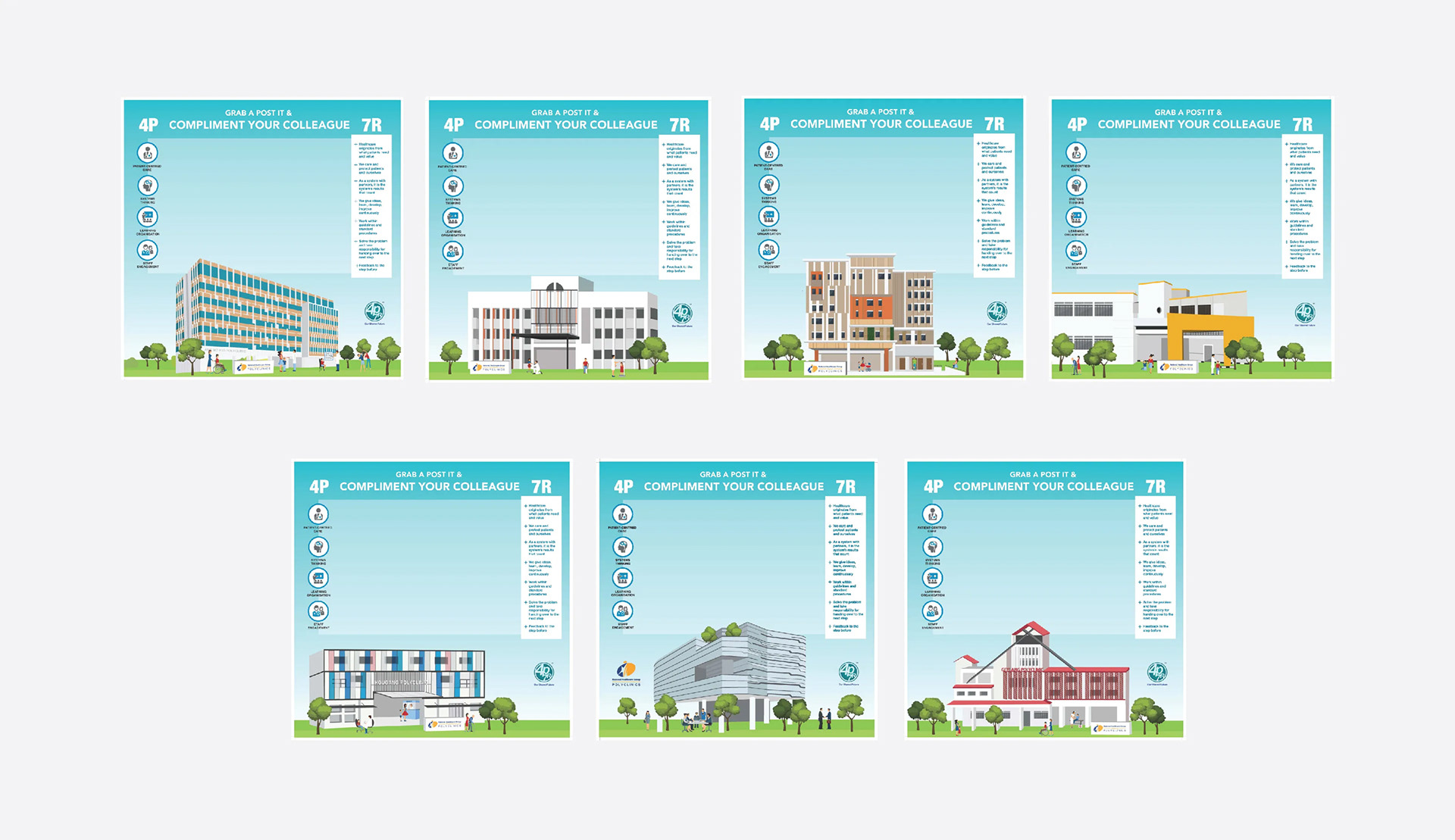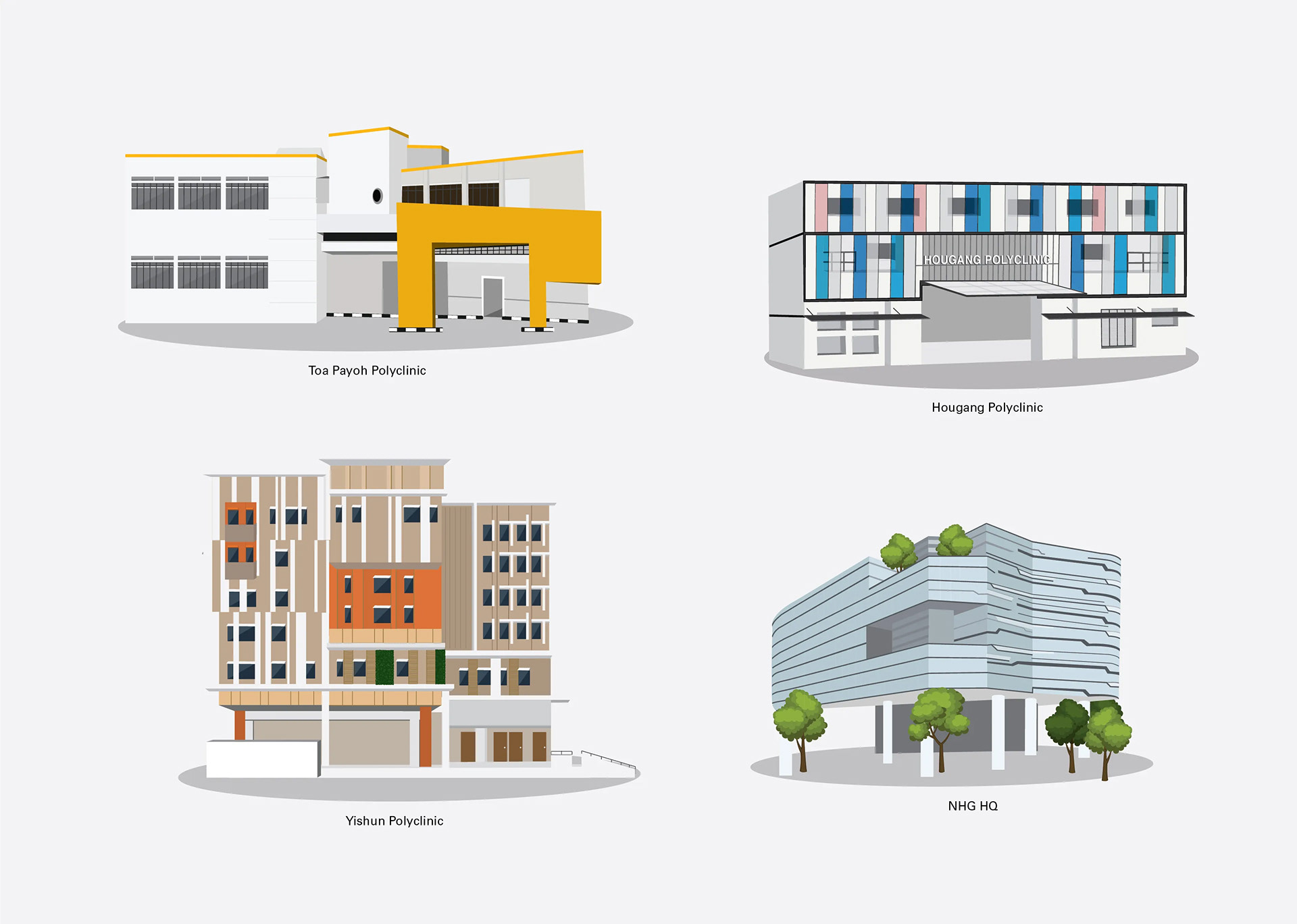 NHG wanted us to design 7 boards for their individual polyclinics. They were hosting a event for their staff which requires them to use post-its to compliment their collaegues on the respective boards. The boards have to be attractive and reflect the individual polyclinics. Hence, we proposed to illustrate each unique polyclinic building across the 7 boards. The Illustrated Buildings The individual polyclinics were illustrated based on the images provided or through google map search. Each individual buildings has their own unique architecture and colours, hence, it is easy to identify the different polyclinics at one glance.
