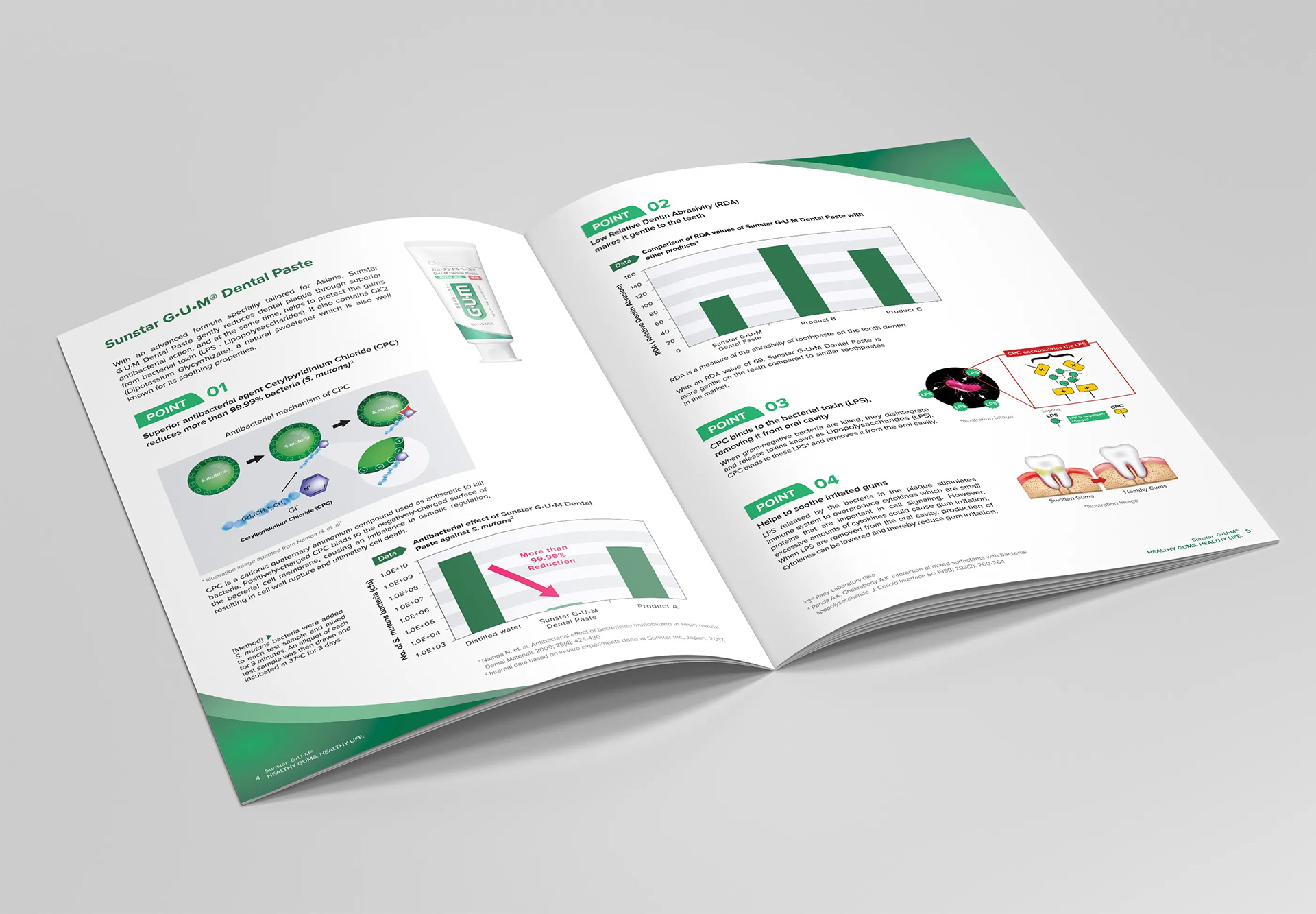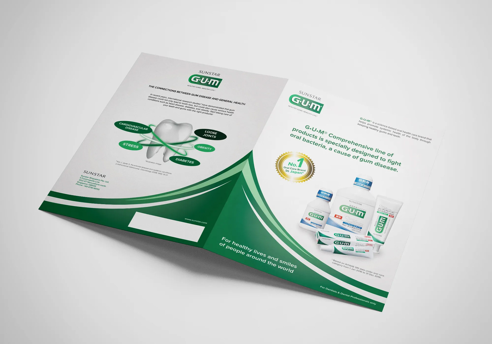 Sunstar Toothpaste Brochure Sunstar wanted to do a 8pp A4 informative brochure to showcase its range of toothpaste product. Targeting dentists and dental professionals, this brochure aims to provide details of how effective their toothpaste are through its scentific information and statistics. The brochure uses the corporate colours of green and white to bring emphasis and consistency of its branding. The play of white spaces is essential here to allow the reader to digest the technical and scientific information easier and also giving a clean and neat outlook for a dental care brand.